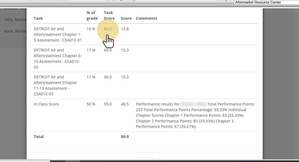 5. A box pops up with a breakdown of the student's chapter exam scores and In Class Score (if already entered) |